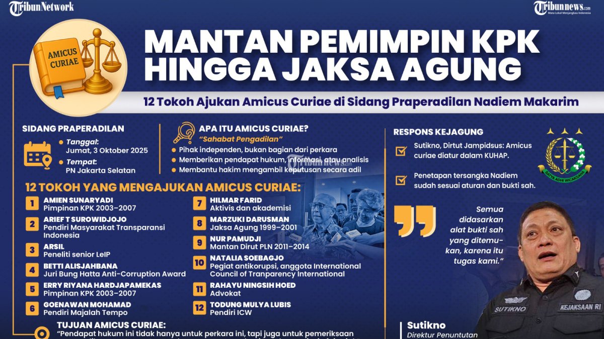 Beberapa waktu lalu, sebanyak 12 tokoh antikorupsi menyampaikan amicus curiae dalam sidang praperadilan Nadiem. Tokoh-tokoh tersebut antara lain mantan Jaksa Agung Marzuki Darusman dan eks pimpinan KPK Amien Sunaryadi. Amicus curiae disampaikan langsung dalam sidang perdana praperadilan Nadiem di Pengadilan Negeri Jakarta Selatan, pada Jumat (3/10/2025).