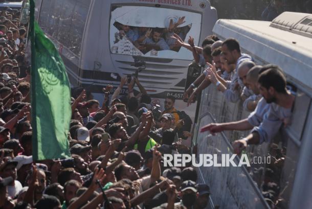 Warga Palestina bergegas menerima tahanan yang dibebaskan Israel. Ribuan orang berkumpul di dalam dan di sekitar Rumah Sakit Nasser di Khan Younis di Gaza selatan, beberapa mengibarkan bendera Palestina, yang lain memegang foto kerabat mereka.